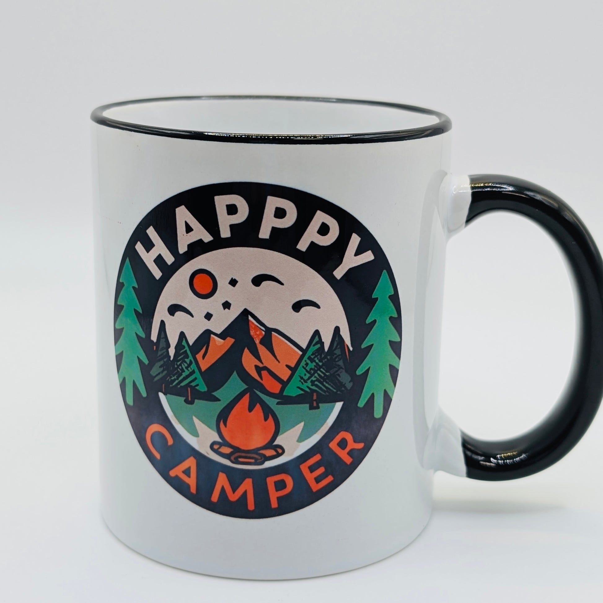 Happy Camper 11oz Ceramic Mug with black handle and rim